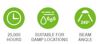 Suits existing 3-way socketsDelivers evenly diffused omni-directional lightRated for damp conditions, indoors and outdoorsShines 22x longer than—and offers 80% energy savings over—comparable incandescentsWorks in ceiling lights, decorative fixtures, and even entirely enclosed fixtures (without overheating them)Lamp life (L70 rated) at 25,000 hours