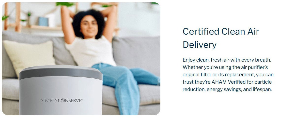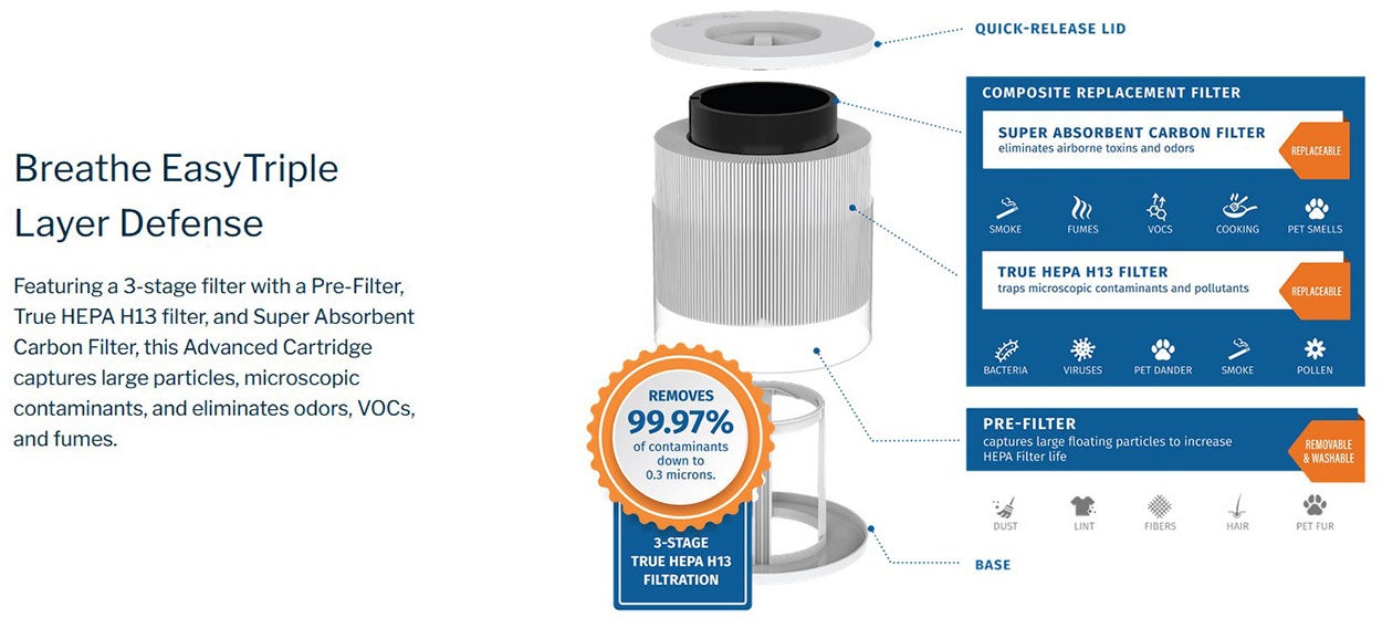 Maximize Comfort. Optimize health, wellness, and affordability with the Simply Conserve® Advanced Air Filter Cartridge. Featuring a 3-stage filtering process with individually replaceable HEPA and Carbon components, our patent-pending Advanced Cartridge significantly reduces replacement filter costs and landfill waste—making it easier than ever to enjoy a breath of fresh air. The unit’s removable and washable Pre-Filter captures large particles including dust, lint, and pet fur. It's replaceable composite True HEPA H13 and Carbon Filter eliminates 99.97% of contaminants down to .03 microns including bacteria, viruses, mold, allergens, toxins, and odors to make spaces healthier and more refreshing.
