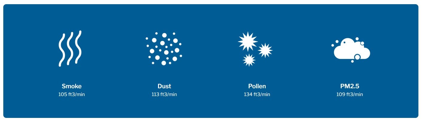Smoke 105 ft3/min, Dust 113 ft3/min, Pollen 134 ft3/min, PM2.5 109 ft3/min.