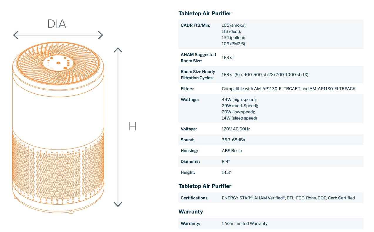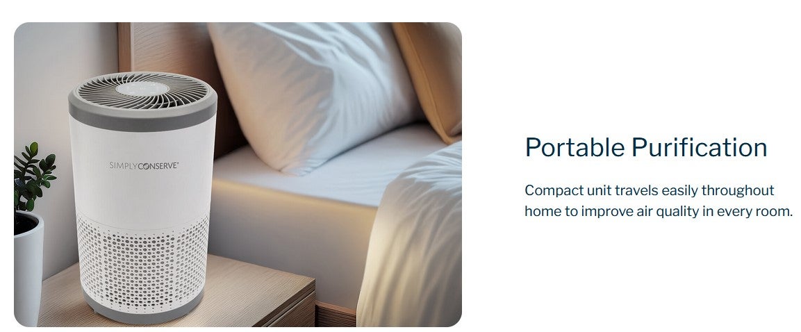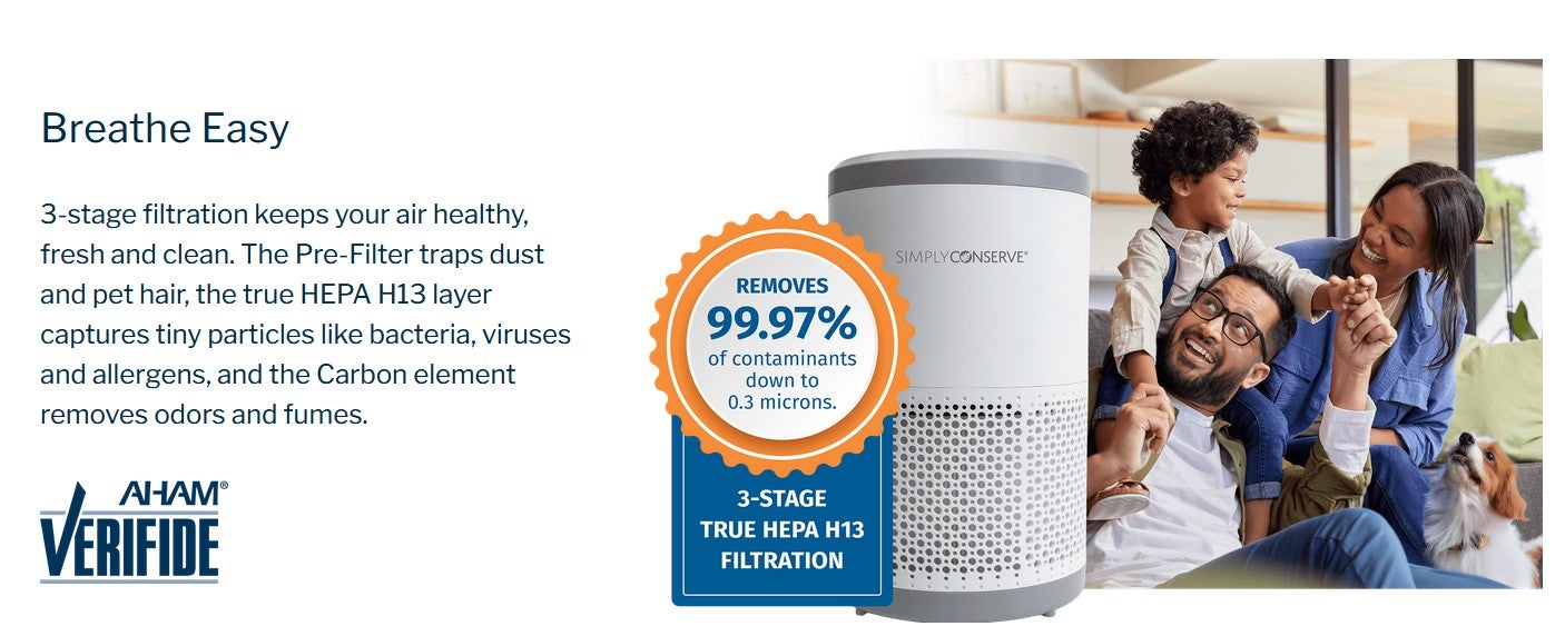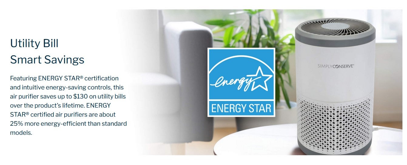 Breathe easy. Featuring superior air purification and energy efficiency with AHAM Verified® and ENERGY STAR® certifications, the Simply Conserve® Tabletop Air Purifier is the ideal portable solution for improving wellness, effortlessly saving energy, and lowering utility bills. Its patent-pending Advanced Cartridge uses a 3-stage purification system with a replaceable True HEPA H13 and Carbon composite filter to efficiently remove pathogens, toxins, allergens, asthma triggers, and odors— keeping homes healthier while significantly reducing replacement filter cost and landfill waste. Intuitive touch settings for varied filtration speeds and run-times make operation a breeze.
