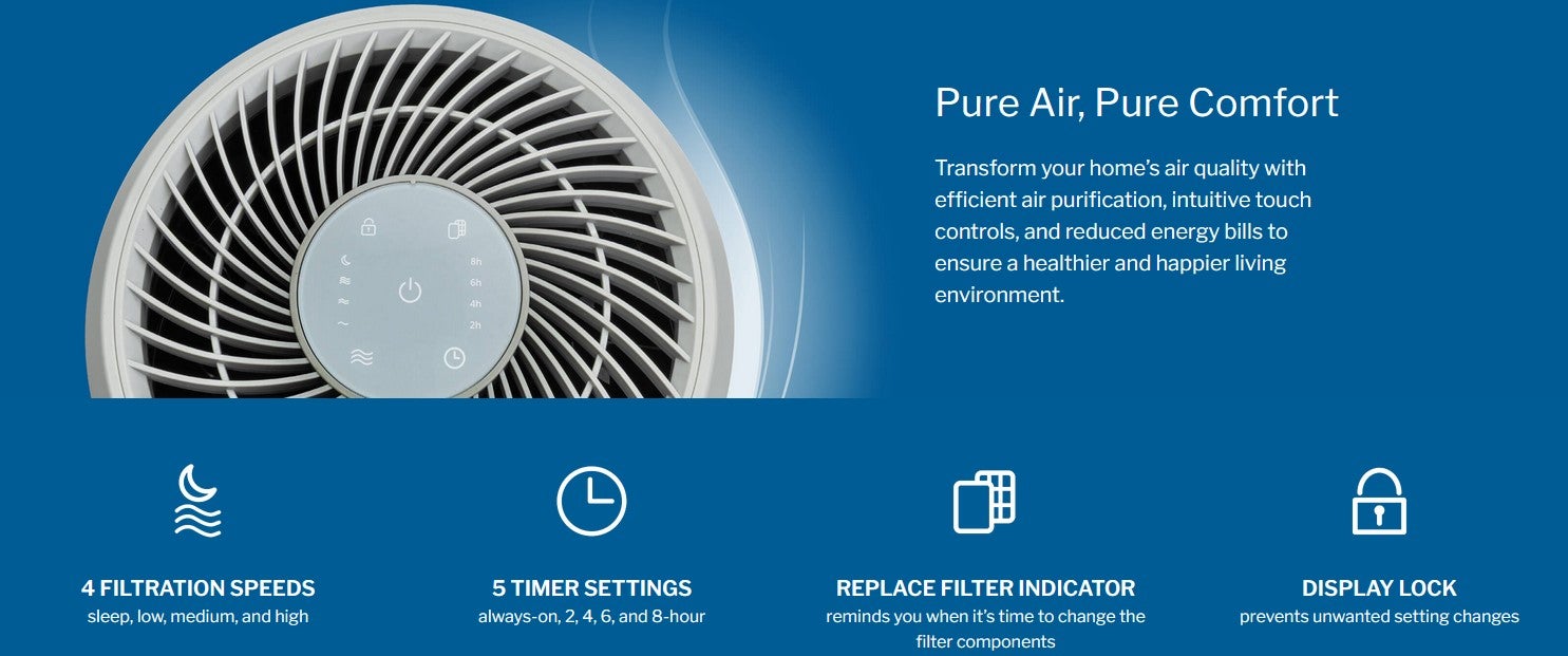 4 filtration speeds (sleep, low, medium, and high), 5 filtration timer settings (always on, 2-hour, 4-hour, 6-hour, and 8-hour), display lock prevents accidental setting changes, replace filter indicator.